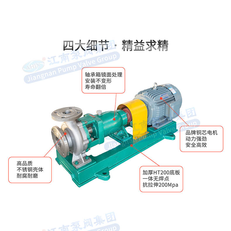 - 安徽江南泵阀制造的不锈钢离心泵耐腐性强,性能稳定可靠,噪音低,振动小,维护成本低,机械强度高,寿命长。
